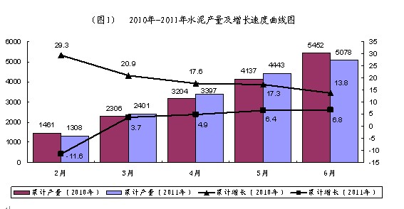由(圖1)可看到,與2010年相比,我省2011年上半年水泥累計產量穩定增長,但增幅有所回落。上半年廣東水泥產量增速為6.8%,低于全國平均水平6.1個百分點。落后水泥產能得到進一步淘汰,廣東水泥產品結構進一步優化,新型干法水泥占市場主導地位,優質水泥產量逐步提高。