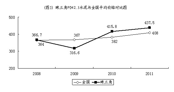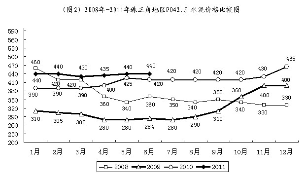 從縱向比較看,從2010年起,廣東PO42.5水泥平均價格開始好于全國平均水平,噸水泥價格突破400元,2011年上半年珠三角PO42.5平均價格繼續保持穩定,高于全國平均水平(見圖3)。