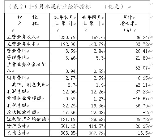 2011年1-6月,我省水泥行業實現主營收入230.79億元,累計增長36.24%,利潤總額為22.96億元,累計增長87.28%(見表2),經濟效益繼續好轉。