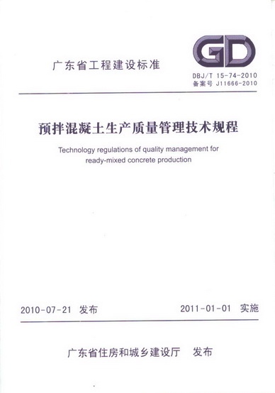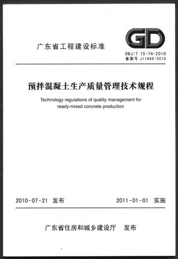 7、2010年7月21日,廣東省住房和城鄉(xiāng)建設(shè)廳關(guān)于發(fā)布廣東省標(biāo)準(zhǔn)《預(yù)拌混凝土生產(chǎn)質(zhì)量管理技術(shù)規(guī)程》的公告(粵建公告〔2010〕39號),批準(zhǔn)《預(yù)拌混凝土生產(chǎn)質(zhì)量管理技術(shù)規(guī)程》為廣東省地方標(biāo)準(zhǔn),編號為DBJ / T15—74—2010,自2011年1月1日起實(shí)施。規(guī)程由廣東省住房和城鄉(xiāng)建設(shè)廳負(fù)責(zé)管理,廣州大學(xué)負(fù)責(zé)具體技術(shù)內(nèi)容的解釋。
