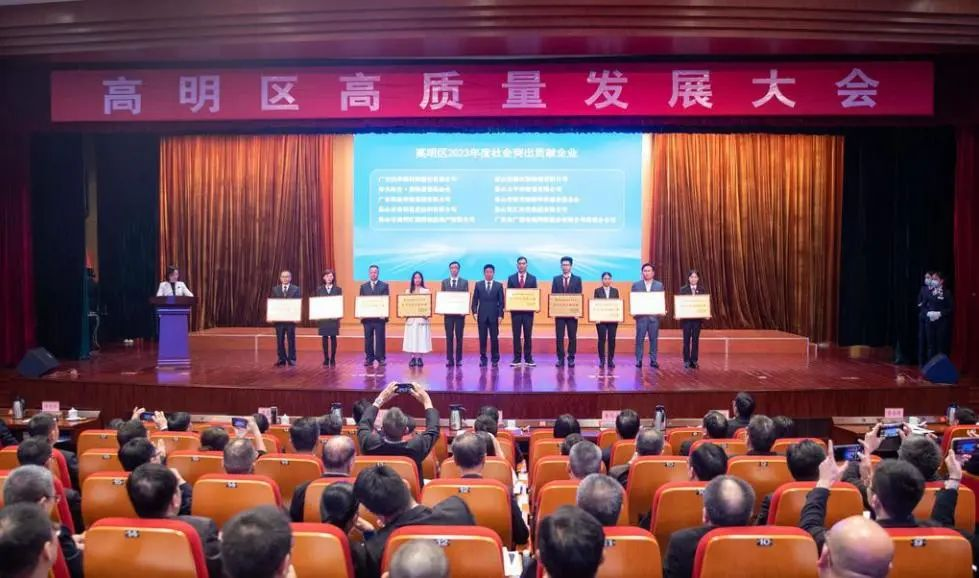 2月19日,高明區召開全區高質量發展大會,推動高明加快追趕超越,奮力開創全域高質量發展新局面,并對廣東班格投資集團有限公司等十家企業授予“佛山市高明區2023年度社會突出貢獻企業”榮譽稱號。
