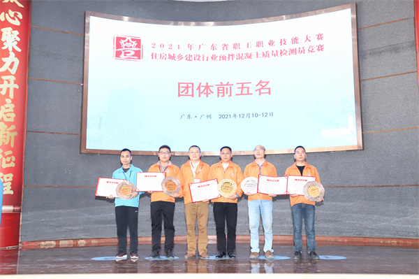 獲得本次競賽團體總成績第一名的是東莞市駿宇混凝土有限公司代表隊,獲得第二至五名的分別是深圳市恒利隆控股集團有限公司東莞分公司代表隊、江門華潤混凝土棠下有限公司代表隊、汕頭市住房和城鄉(xiāng)建設(shè)局代表隊、佛山市建筑業(yè)協(xié)會混凝土與水泥制品分會一隊。