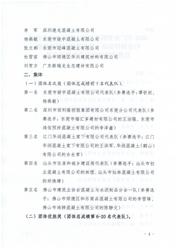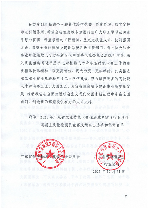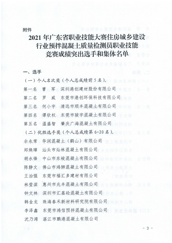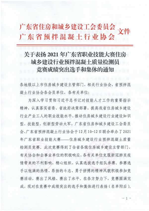 關于表揚2021年廣東省職業技能大賽住房城鄉建設行業預拌混凝土質量檢測員競賽成績突出選手和集體的通知